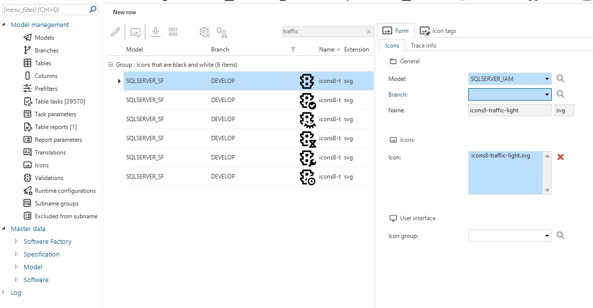 However often you do want to use a set, or all of these icons, within multiple models. Currently the only way to copy an icon from a mode into a different model, is by opening a second software factory. Selecting the model/branch from which you would like to copy this. Download the icon and then add a new icon in the model/branch you were working in. Select the downloaded icon and store it.