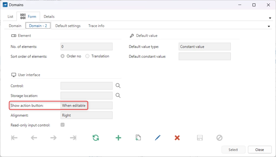 Additionally: could ‘Show action button’ be empty when creating a new domain so developers are forced to make a choice? Or make the default value for this field configurable.
