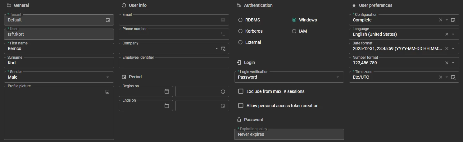 On the user screen, you have the option to set a custom number and date format per user: