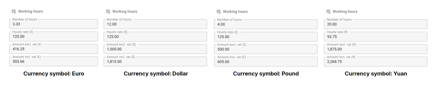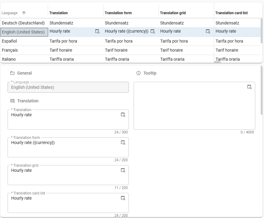 If your organization operates internationally, you might deal with invoices in multiple currencies. A common headache: users see an amount but have to look elsewhere to figure out whether it is in euros, dollars, or pounds. With parameterized translations, you can include the currency symbol directly in the column label. Set the form translation to Hourly rate ({currency}) and the label dynamically shows Hourly rate (€), Hourly rate ($), or Hourly rate (£) depending on the customer. No separate currency column needed.