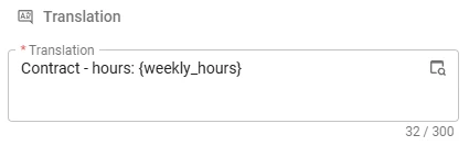 The configuration is surprisingly simple. In a translation field, you reference another column from the same subject by wrapping the column name in curly braces. For example: Contract – hours: {working_hours}. At runtime, the platform replaces the reference with the actual value from the current record. That is all there is to it.