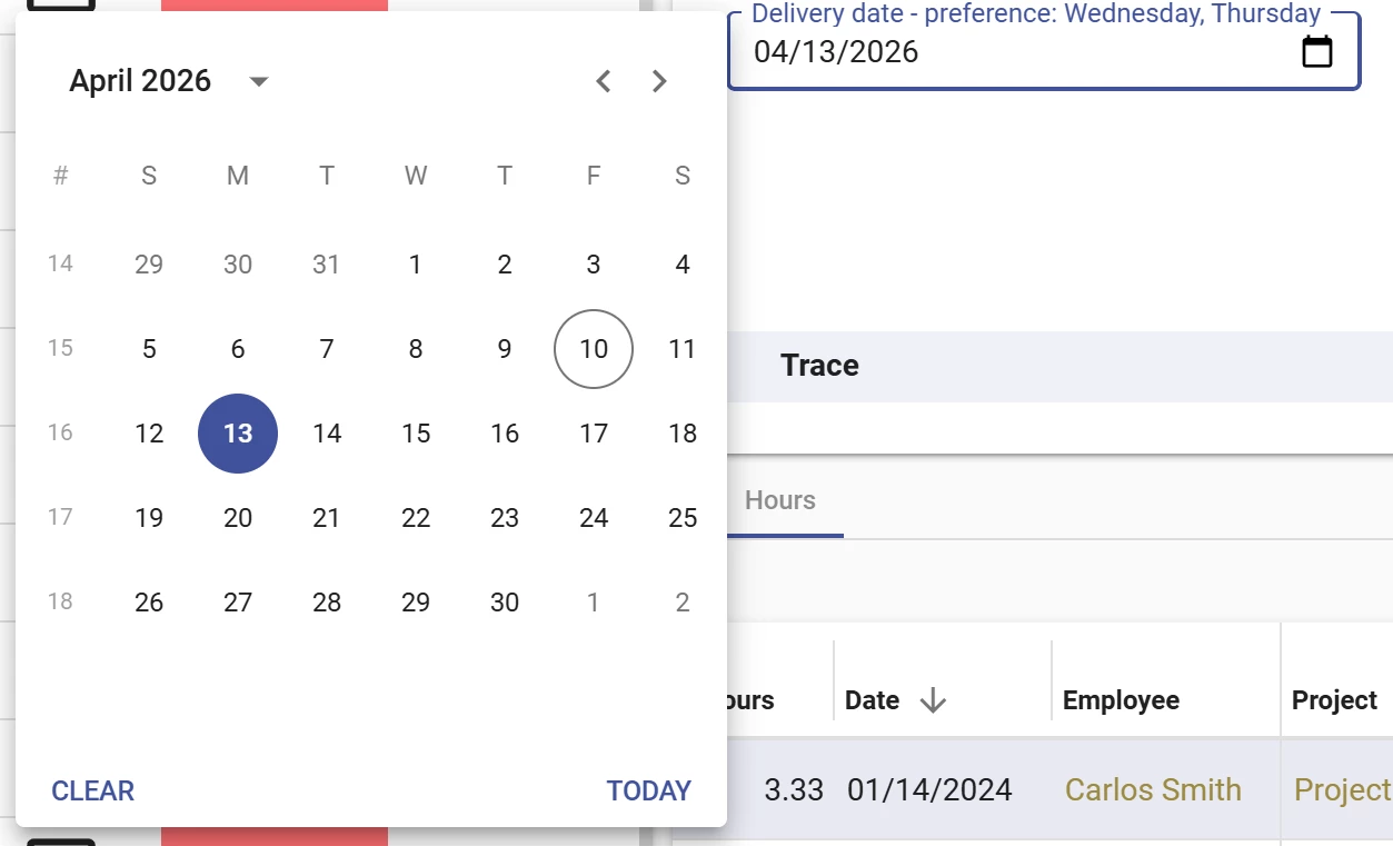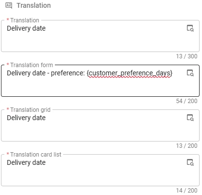When your logistics team schedules a delivery, they need to know which days the customer prefers to receive goods. Before, this required a lookup or an expression field next to the date picker. With a parameterized translation on the delivery date column, such as Delivery date – preference: {customer_preference_days}, the preferred days appear right in the field label. The user sees Delivery date – preference: Wednesday, Thursday while picking the date. This makes the form richer and more data-dense, without any additional fields on the screen.