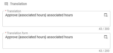 Parameterized translations also work in task parameter labels, which opens up some great possibilities. One of the most useful: showing totals from underlying detail records directly in the task pop-up. Consider an invoice approval task. The parameter label Approve {associated_hours} associated hours tells the user exactly how many hours are attached to the invoice they are about to approve. Instead of a generic Approve button, users see Approve 21 associated hours. That kind of context makes the action more transparent and helps prevent mistakes.