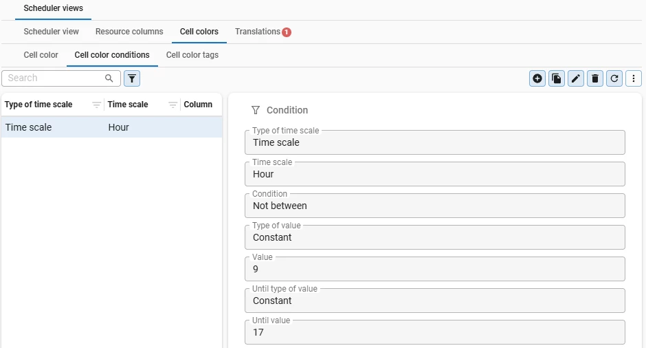 For example: if all your resources share the same working hours, a single time scale condition on Hour is enough. Set the cell color and add the condition not between 9 and 17. Every cell outside that window turns red, without any further configuration.