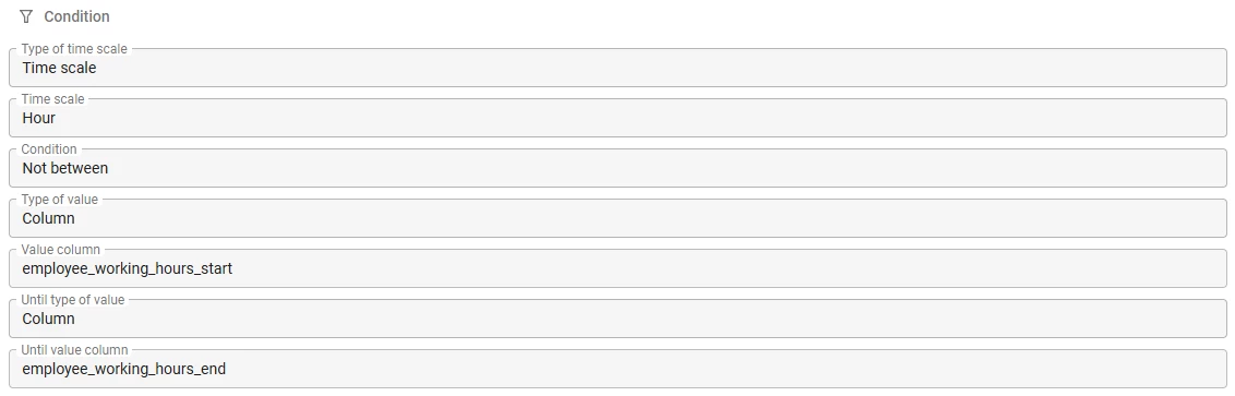 If working hours vary per employee, change the condition type of value to column to use the working hours of each individual employee. The Scheduler then colors each employees non-working hours individually, based on its own data.