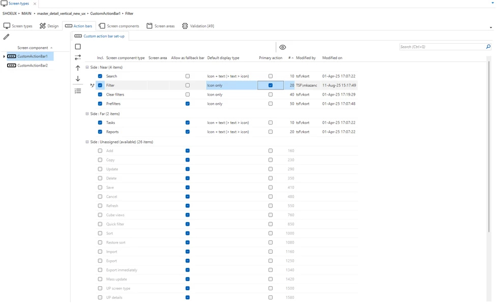 Since release 2025.2, the Filter button is by default placed next to the Search bar instead of inside the Overflow menu of the Action Bar. This provides a more intuitive and consistent filtering experience across the Universal UI. For existing models, this change is applied through an enrichment, ensuring they automatically adopt the new standard without requiring manual adjustments.