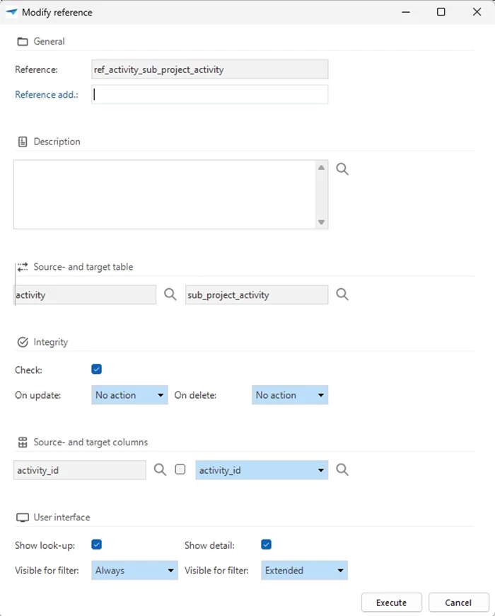 For example, a reference between Activity and Sub_project_activity could have the Look-up (activity_id) set to Always, making it constantly available for filtering, while the Detail (sub_project_activity) is set to Extended, appearing only when a user adds it manually. Rarely used tables, such as internal log tables, can be set to Never.