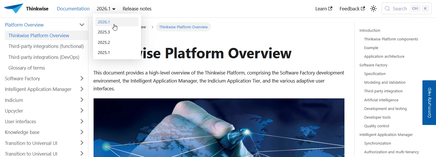 Versioning is now available for our Thinkwise Documentation. You can switch between different versions of the documentation using the version dropdown located at the top left of the page. This allows you to access documentation that corresponds to the specific version of the Thinkwise Platform you are using, ensuring that you have the most relevant and accurate information at your fingertips.