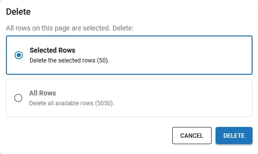 To select rows, use keyboard shortcuts to select all the rows on the current page. Then, select Delete from the action bar. In the pop-up, select whether to delete the Selected rows or All rows that match the current filter. Select Delete to confirm the deletion.