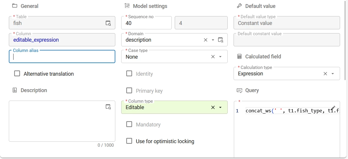 Previously, columns with calculated fields could only be set to Read-only or Hidden. You can now set columns with an Expression field to Editable in the menu Data > Data model > tab Tables > tab Columns. This can be useful, for example, when you want to use an expression field as an input field for a query.