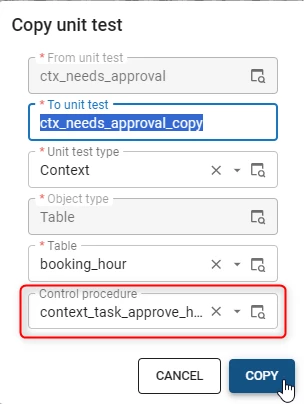 Unit tests help you test each unit of functionality of an application separately. In the Software Factory, you can link unit tests to control procedures to ensure that they work as expected. Previously, when you copied a unit test in the menu Quality > Unit tests > task Copy unit test, the field Control procedure remained empty even if it was linked to a control procedure. This behavior has been improved. If you now copy a unit test with a linked control procedure, the Control procedure field is automatically completed.