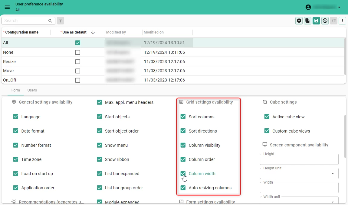 To allow column width settings to be saved for a user, Column width must be included in a user preference configuration. Use one of the standard configurations Resize, Move, On_Off or Complete. Alternatively, create a custom configuration in the menu Advanced > Master data > User preference availibility and select the checkbox Column width in the group Grid settings availability.