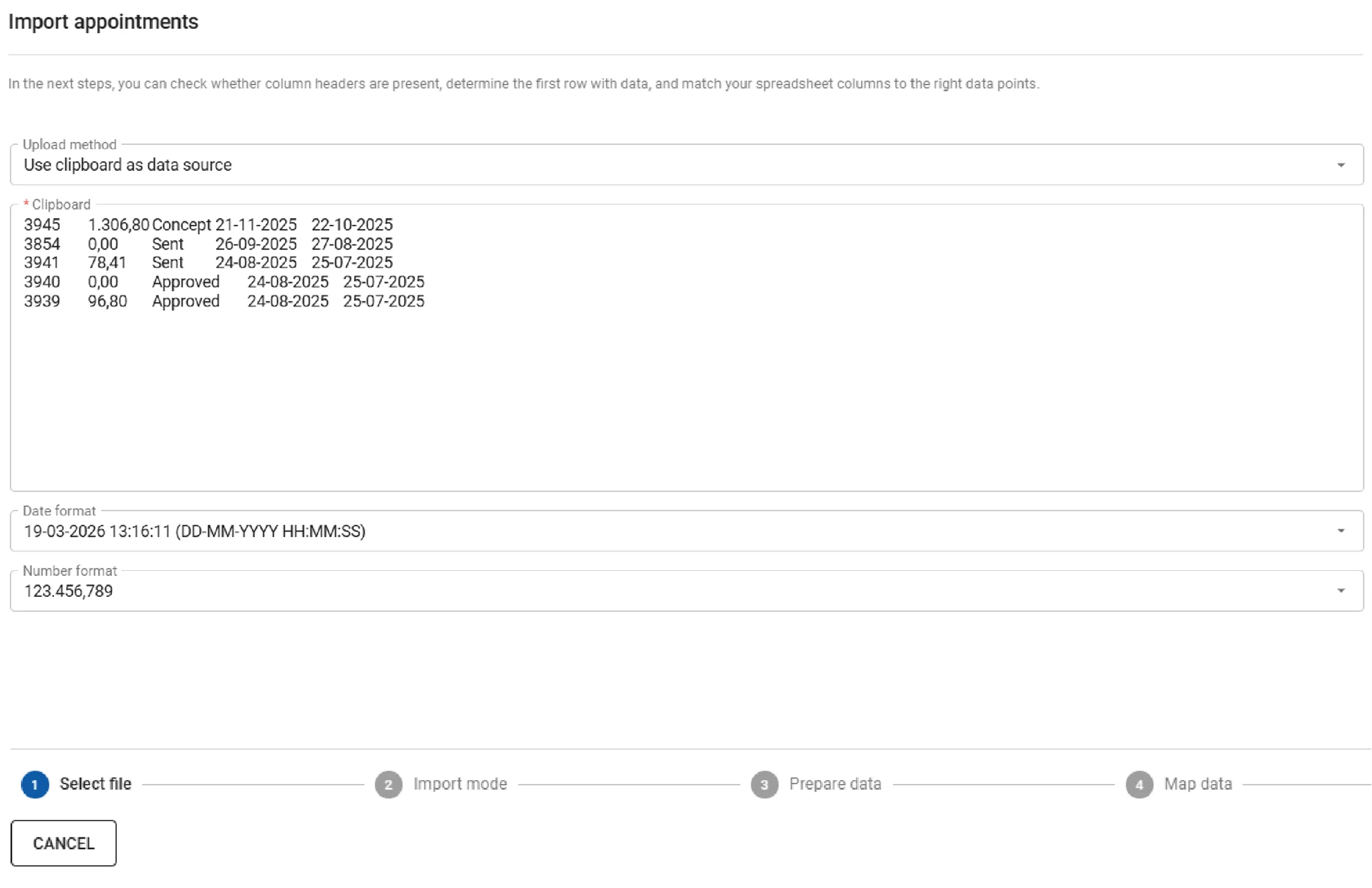 To import data from the clipboard, select Import from the overflow menu. In the pop-up, select Use Clipboard as data source as Upload method. Then, paste the data into the field Clipboard. Configure the Date format and Number format to match the data's format. After this, continue the import steps as usual.