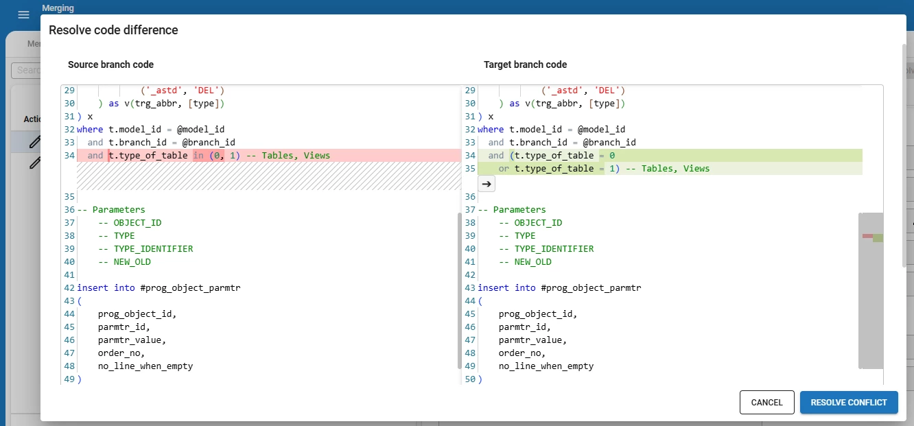 - menu Models > Merging > tab Active conflicts > task Resolve code difference