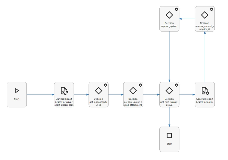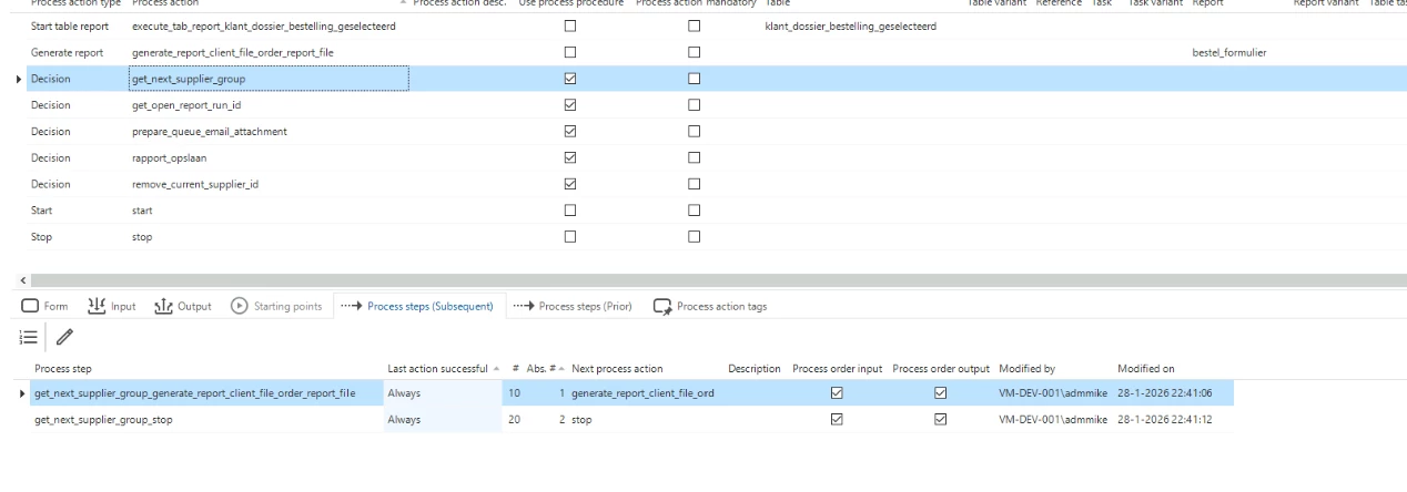 In our application, we have a process flow loop to generate reports. when the customer places an order he can select 1 or more order lines. Attached to the order lines are suppliers. The report loop groups the order lines per supplier to generate 1 report per supplier.