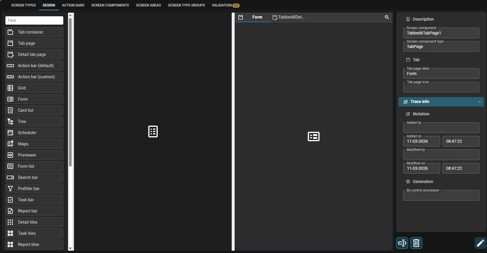It clearly contains a tab bar, but it simply refuses to pop up when I reload the screen. Why would this be, is there something I miss? I want the detail tab to show. I do have a context on this screen that tells what detail tab I should see based on a value. But that did not interfere with the tab bar showing up or not. Now I see nothing, but I did see a tab bar with a form tab and a detail tab (based on a value). What am I doing wrong?